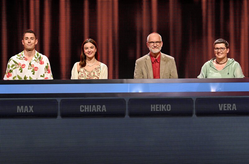 ARD GEFRAGT - GEJAGT FOLGE 872, "Alexander Bommes präsentiert beliebtes Quizformat", am Donnerstag um 18:00 Uhr im ERSTEN. Aufzeichnung zum ARD-Quiz „Gefragt-Gejagt“ Moderator Alexander Bommes mit den Kandidaten (v.l.n.r. am Panel): Max Sutter, Chiara Görner, Heiko Reinhold, Vera FärberBild: © ARD/Uwe Ernst