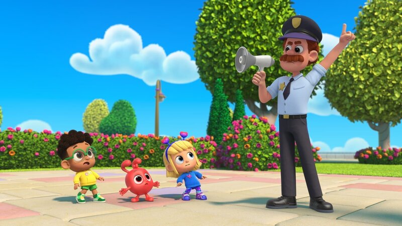 l-r: Jordie (Ayden Elijah), Morphle (Ben Pronsky), Mila (Lexie Foley), Officer Freeze (Dino Andrade)