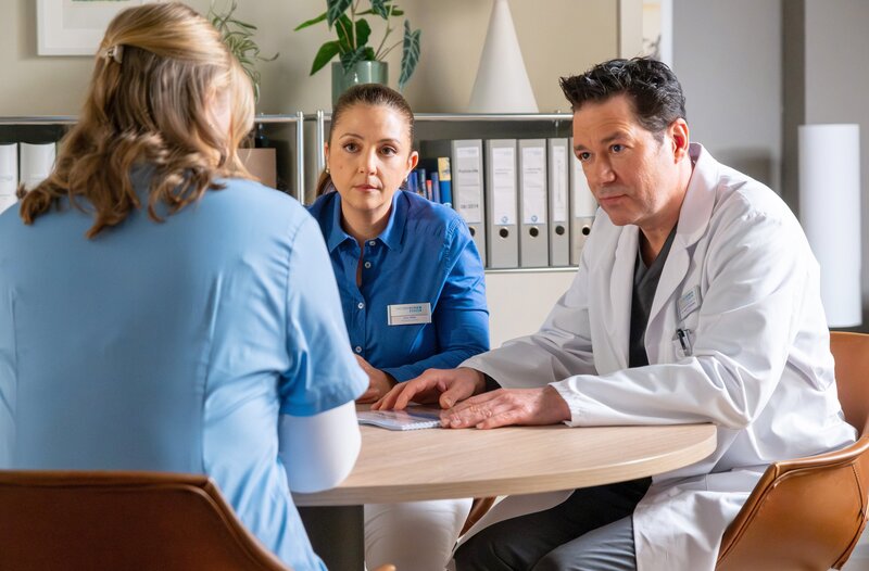 Chefarzt Dr. Philipp Brentano (Thomas Koch, re.) und Pflegedienstleiterin Arzu Ritter (Arzu Bazman, mi.) haben Miriam Schneider (Christina Petersen, li.) zu einem Gespräch gebeten.