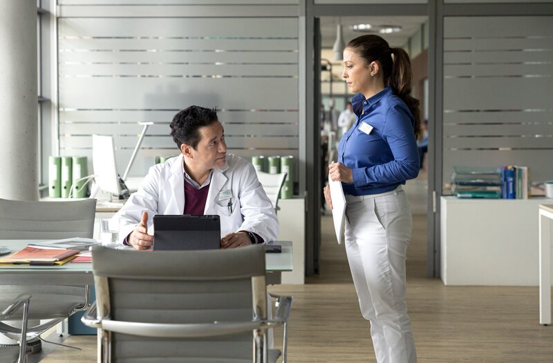 Arzu Ritter (Arzu Bazman) hat die Ergebnisse der Befragung zur Patientenzufriedenheit in der Hand. Ihr Mann Dr. Philipp Brentano (Thomas Koch) kann sich nicht vorstellen, dass diese nicht ausgesprochen toll ausgefallen ist, doch irgendwas belastet Arzu.