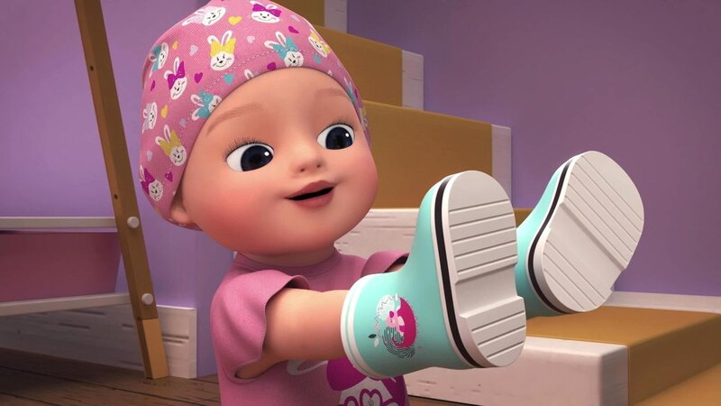 Emma und Teddy haben eine lebhafte Fantasie und wollen im Regen spielen. Doch ihre Gummistiefel an den Händen hindern sie daran, echte Regenwolken zu berühren. Teddy versucht Emma zu erklären, dass Schuhe an die Füße gehören.