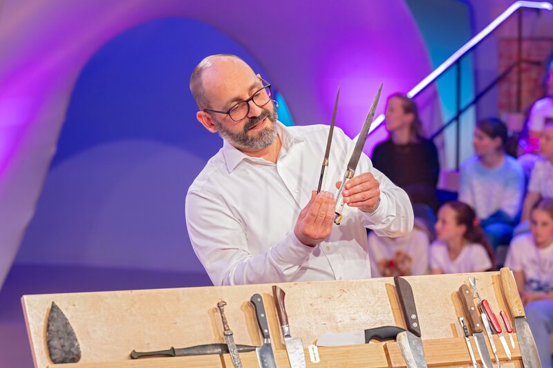 Schnipp, schnapp! Elton geht mit Dr. Sixt Wetzler auf Zeitreise: Er zeigt, wie aus den ersten Faustkeilen scharfe Klingen wurden und welche Bedeutung das Schneiden für die Menschheit hatte. Reporterkind Max beschäftigt sich ebenfalls mit dem Thema Schneiden - allerdings ganz anders: Beim Filmschnitt lernt er von Tom, wie man mit dem Computerschnittprogramm verblüffende Stopp-Tricks zaubert. Ob die Rateteams wissen, wie der Filmtrick funktioniert? Auch die Schere darf beim Thema Schneiden nicht fehlen. Es gibt sie in vielen Varianten: Rechts- und Linkshänderscheren, Zickzackscheren oder Nasenhaarscheren - jede mit ihren eigenen Eigenschaften. Und zum Schluss: Wie schneidet man eine Glasflasche? In einer spannenden Demonstration wird gezeigt, wie das ganz ohne Schneidewerkzeug und mit etwas Geschick gelingt. Die Rateteams kommen heute aus Alzey/Deutschland, Lochau/Österreich und Warschau/Polen. Die Quizshow für die ganze Familie. "1, 2 oder 3" vermittelt Wissen auf unterhaltsame und spielerische Weise. Helle Köpfe sind gefragt und auch flinke Beine. Denn die Rateteams geben ihre Antworten durch das Springen auf eines der Antwortfelder. Bei "1, 2 oder 3" können die Fans zu Hause über HbbTV live mitspielen, und bereits ausgestrahlte Sendungen lassen sich auch online über 12oder3.de oder die ZDFtivi-App beim Videoquiz nachspielen. Wer noch nicht genug hat, kann im Zockerquiz quizzen ohne Ende. Für Vorschulkinder gibt es auf zdftivi.de und in der ZDFtivi-App das Angebot "Moin Piet - Quiz mit Quatsch".