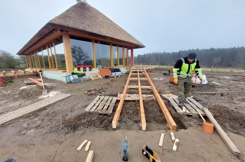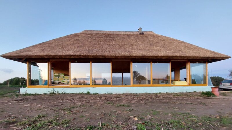 Das Reetdachhaus am Kummerower See erinnert von der Ferne aus betrachtet an die traditionellen Bauernhäuser, die einst in Mecklenburg standen, doch das neu erbaute Traumhaus mit seinen großen Glasflächen ist modern und zukunftsorientiert. Es passt sich zwischen Walnussbäumen und Apfelrosen so gut in die Natur ein, dass die rundum grasenden Kühe und Pferde sich von den Bauarbeiten nicht beeindrucken lassen.