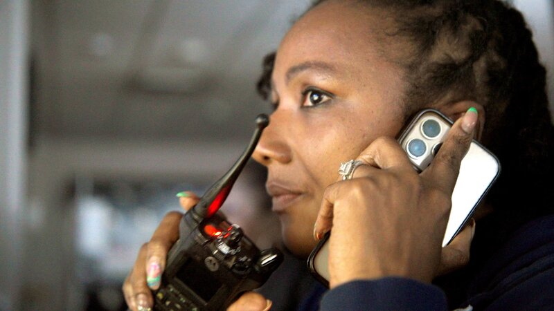 A policewoman is speaking on the phone and carrying a walkie-talkie.