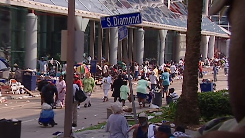• Gestrandete Einwohner von New Orleans versammeln sich nach dem Hurrikan Katrina im Jahr 2005 vor dem Convention Center.