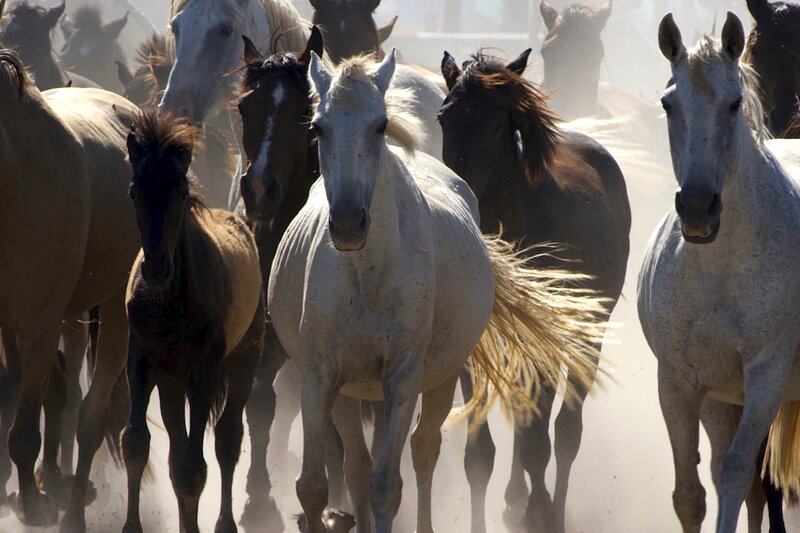 Alljährlich werden die halbwild lebenden Mesteño-Stuten und ihre Fohlen zusammengetrieben.