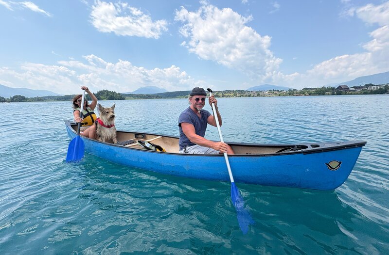 Britta (l) und Andreas mit ihrem Hund Toni auf dem Faaker See.