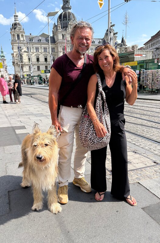 Britta (r) und Andreas mit Hund Toni vorm Rathaus in Graz.