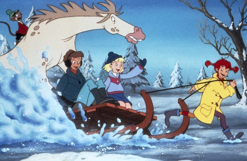 • Pippis Pferd "Kleiner Onkel" ist völlig fertig von Pippis Versuch, ihm Skispringen beizubringen. Also spannt sie sich selbst vor den Schlitten.