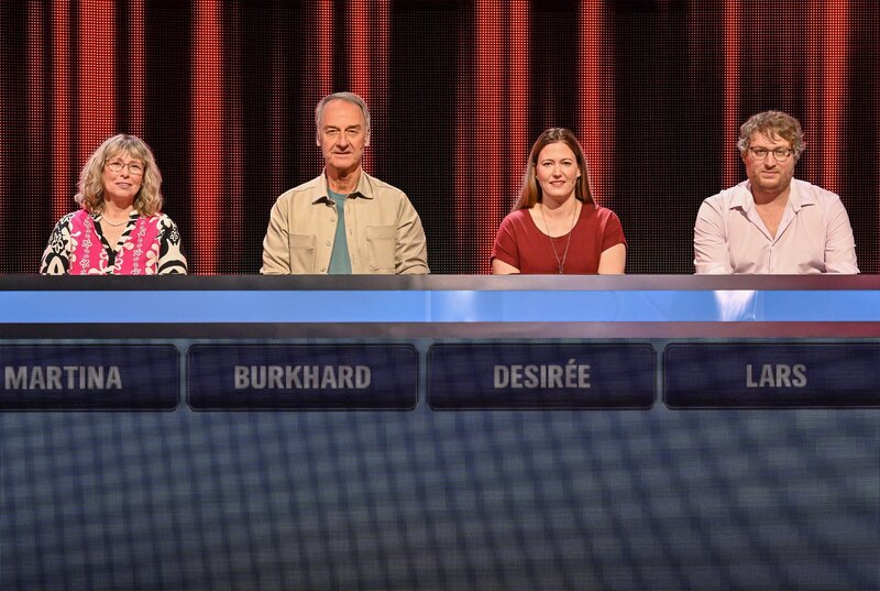 ARD GEFRAGT - GEJAGT FOLGE 891, "Alexander Bommes präsentiert beliebtes Quizformat", am Donnerstag (14.08.25) um 18:00 Uhr im ERSTEN. Aufzeichnung zum ARD-Quiz „Gefragt-Gejagt“ Die Kandidaten (v.l.n.r. am Panel): Martina Peine, Burkhard Wagner, Desirée Hofer, Lars Rauhut.Bild: © ARD/Uwe Ernst