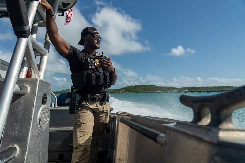 AMO-Agent Smith steht auf einem Boot und blickt auf das offene Meer in Fajardo, Puerto Rico.