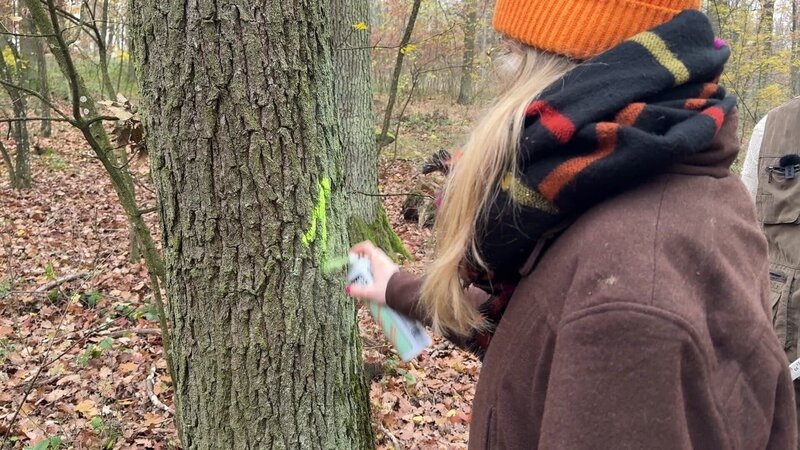 Lena riecht an dem Verbissschutz, mit dem Förster Max und sie Douglasien eingeschmiert haben.