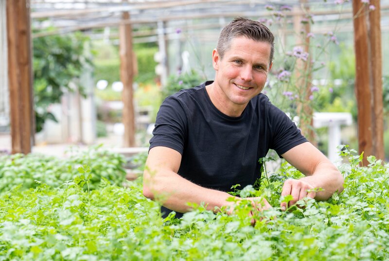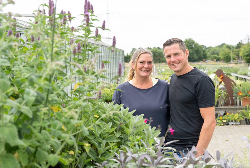 Rund 200 verschiedene Küchen- und Heilkräuter sind die große Leidenschaft von Henry Rohlmann (r) in Münster. Diese Pflanzen sind wahre Sinneswunder. In den Gewächshäusern und auf den Außenanlagen duftet es betörend. Der 45-Jährige lebt mit Frau Maike (l) und den drei Kindern auf dem Hof.