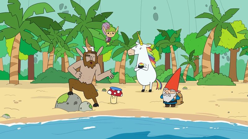 • Von links: Hufius, Twinkle, Tupfen, Blümchen und Herbert. Die Helden müssen zur Insel "Meerhallig", um die Bewohner vor einem Klumpen wütenden Seegrases zu beschützen. Blümchen kann sich aber noch nicht von ihrer regenbogenfarbenen Badebombe trennen.