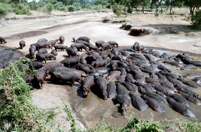 • Nilpferde mögen keine Löwen in ihrer Nähe. Doch seit der einst mächtige Fluss Katuma zusammengeschrumpft ist, versammeln sich alle Tiere an den wenigen verbliebenen Tümpeln, um Wasser zu finden.