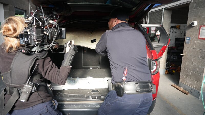 Ein CBP-Beamter arbeitet an der Grenze von San Ysidro daran, Pakete mit mutmaßlichen Betäubungsmitteln aus dem Fahrzeug eines Verdächtigen zu bergen, während ein Kameramann filmt.