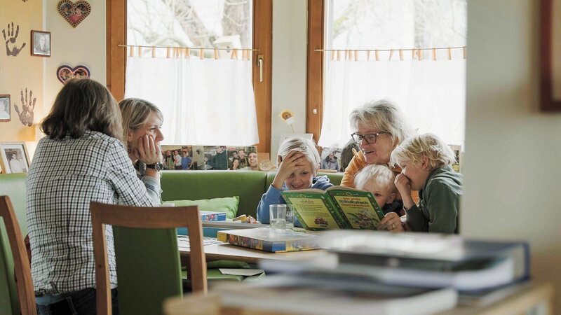 Familie Griessler am Mittagstisch beim spielen und lesen.