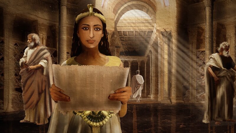 Kleopatra VII. in der Bibliothek von Alexandria.