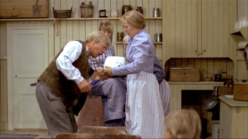"Michel aus Lönneberga", "Als Michel den Kopf in die Suppenschüssel steckte." Die Bewohner Lönnebergas haben Geld gesammelt, das sie Michels Mutter bringen. Verwendungszweck: Michel soll nach Amerika geschickt werden, damit in Lönneberga wieder Ruhe einkehrt. Alma Svensson ist natürlich empört, und selbst Lina ist dagegen. Schließlich hat es in Amerika gerade erst ein Erdbeben gegeben, und eine Katastrophe sollte wohl genug sein. Schon naht weiteres Unheil. Michel steckt nämlich den Kopf in die Suppenterrine, um an die letzten Tropfen zu kommen, bleibt dann aber stecken. Damit die vier Kronen teure Schüssel nicht zerschlagen werden muss, wird Michel nach Mariannelund zum Arzt gebracht. Im Bild (v.li.): Allan Edwall (Anton), Jan Ohlsson (Michel), Emy Storm (Alma).