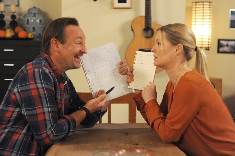 Gregor (Holger Matthias Wilhelm) und Vera (Sybille Waury) vergleichen ihre Gästelisten für die Hochzeit.
