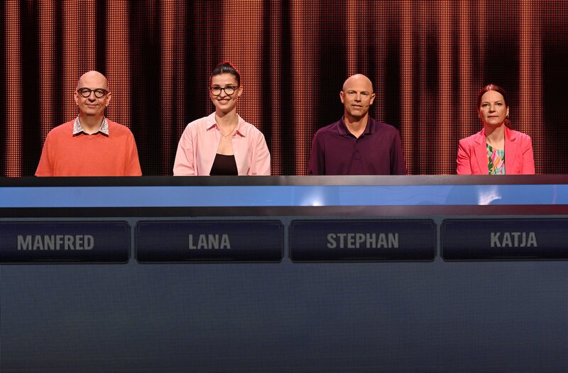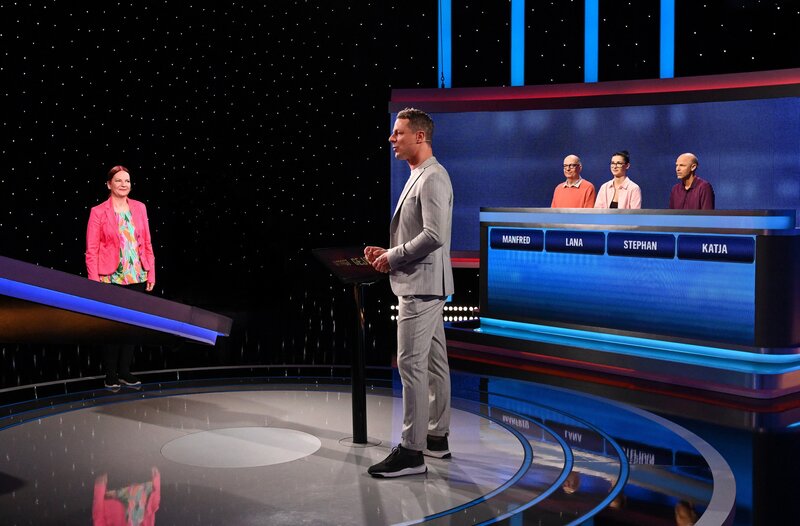 Moderator Alexander Bommes (M.) mit den Kandidat:innen: Katja Illgen (l.), Manfred Plagens (3.v.r.), Lana Lange (2.v.r.) und Stephan Wittkopp (r.).Bild: © ARD/Uwe Ernst