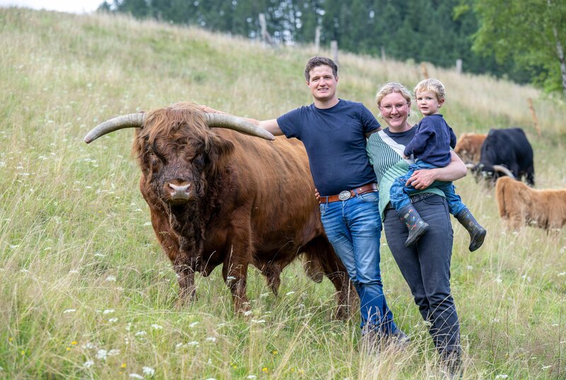 Gastgeberin Conny Stamm (Mitte) mit ihrem Mann Mario und Sohn Eloy vom Biohof Nebeling-Stamm in Herscheid.