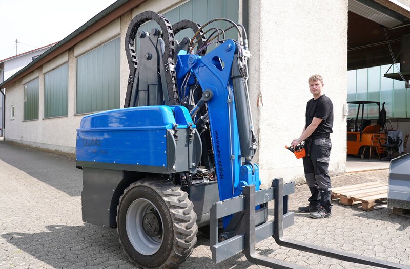 Erfinder Jonas Heinzler aus Ulm neben seiner Erfindung, dem sein fernsteuerbarer Radlader