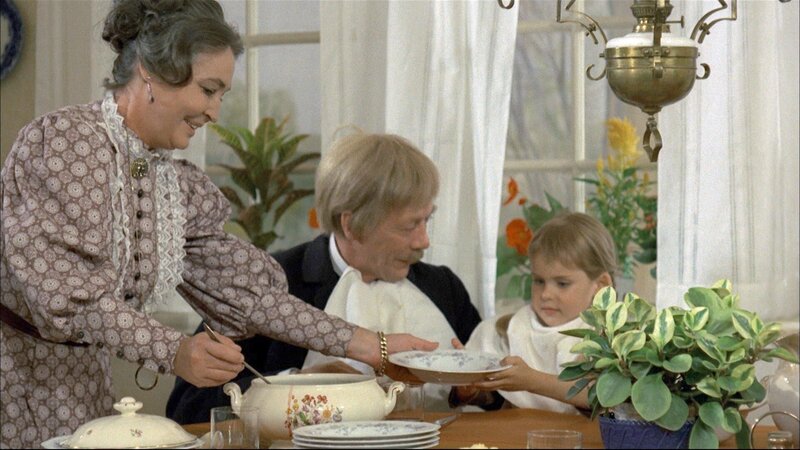 "Michel aus Lönneberga", "Als Michel auf den Markt fuhr." In Vimmerby ist Markt, auch die Svenssons fahren hin. Lina wünscht sich einen Verlobungsring von Alfred, der ziert sich verständlicherweise. Außerdem sind die Zeitungen voll von Schreckensmeldungen: Ein Komet soll just am Markttag auf die Erde herabstürzen. Michel interessiert sich für das Pferd Lukas und ist traurig, als ein Viehhändler es kauft. Allerdings lässt das Tier sich nicht beschlagen, so dass der Händler leichtsinnigerweise sagt, er werde Michel das Pferd schenken, wenn der es festhalten könne. Michel hat erkannt, dass Lukas keineswegs störrisch, sondern nur kitzlig ist. Dementsprechend behandelt er das Tier, so dass die Hufeisen schnell angebracht sind. Dem Händler bleibt nichts anderes übrig, als zu seinem Wort zu stehen. Im Bild (v.li.): Hannelore Schroth (Frau Petrell), Allan Edwall (Anton), Lena Wisborg (Ida).