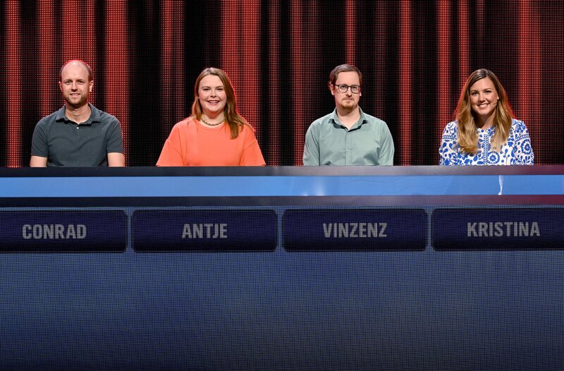 Moderator Alexander Bommes (M.) mit den Kandidat:innen: Kristina Knoblach-Schmidt (l.), Conrad Spanaus (3.v.r.), Antje Bäuerle (2.v.r) und Vinzenz Schindler.Bild: © ARD/Markus Hertrich