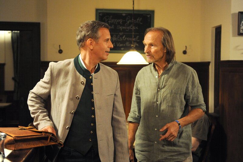 Winkler (Florian Stadler, links) gelingt es, Sascha (Eisi Gulp) an seinem Vorhaben, eine Photovoltaikanlage auf dem Weihergrundstück zu bauen, zweifeln zu lassen.