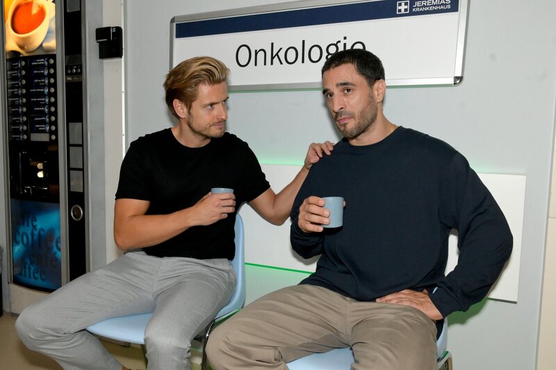 Philip (Jörn Schlönvoigt, l.) versucht Tobias (Jan Kittmann) zu beruhigen, der unruhig wird weil sich seine Untersuchungsergebnisse verzögern.
