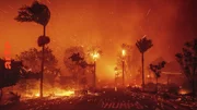 Das Bild zeigt in Flammen stehende Palmen beim Megafeuer Anfang 2025 in Los Angeles. Früher symbolisierten diese Bäume den kalifornischen "Way of Life", heute stehen sie für die Verwüstungen der Klimakatastrophe.