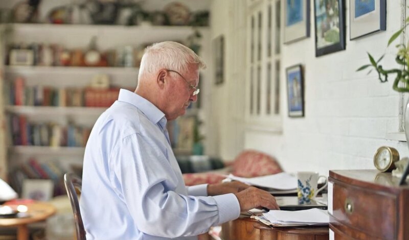Eine Person sitzt an einem Schreibtisch in häuslicher Umgebung und arbeitet mit Unterlagen.