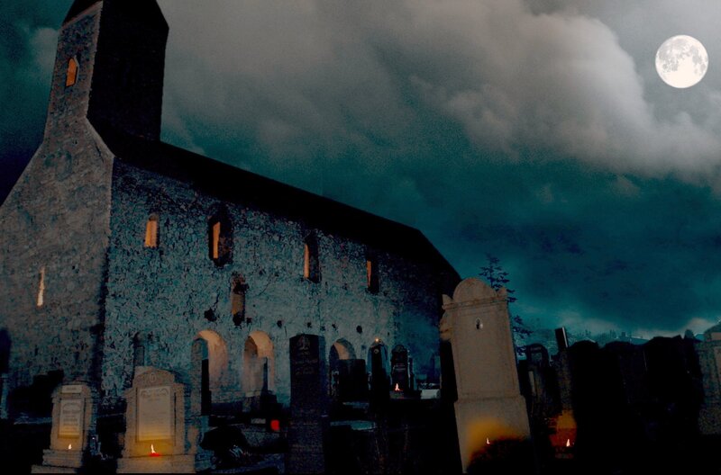 Verlorene Zeit in Stein gemeißelt – die Ruine der Bergkirche von Urwegen erhebt sich über dem Friedhof, ein stilles Zeugnis vergangener Jahrhunderte in Transsilvanien.