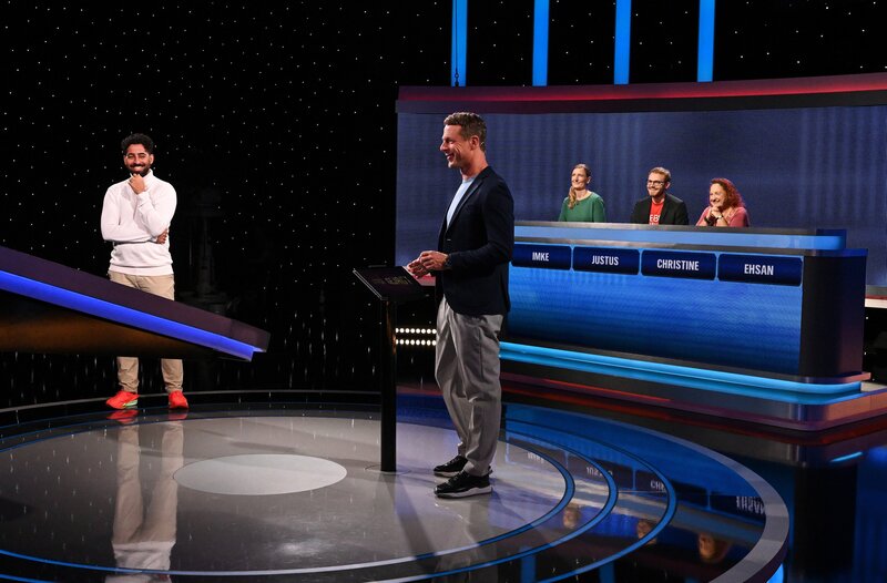 • Moderator Alexander Bommes (M.) mit den Kandidat:innen: Ehsan Allayah Parsa (l.), Imke Höckmann (3.v.r.), Justus Spörel (2.v.r.) und Christine Sachs.