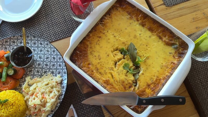 Bobotie ist ein südafrikanisches Gericht aus Hackfleisch, Tomatensoße, Chutney, Rosinen und Gewürzen. Überbacken wird es mit Ei und in Milch getränktem Brot.