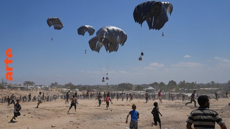 Sommer 2025: Der katarische Fernsehsender Al Araby zeigt den Abwurf von Lebensmitteln über Gaza. Kategorisch bestreitet Israel den Vorwurf, es hungere die Menschen aus, und nutzt diese Abwürfe zur Imagepflege gegenüber der Weltöffentlichkeit. Zoom auf einen PR-Krieg und dessen Hintergründe.