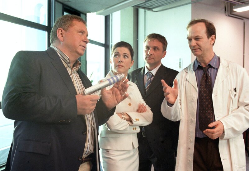 Dr. Sommerfeld (Rainer Hunold, re.) ist verärgert darüber, dass Dr. Kerner (Bernhard Schir) und seine PR-Agentin Nora Hansen (Anja Kruse) ihn für ihre Zwecke eingespannt haben, ohne ihn vorher zu informieren.
