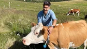 Einstein Sterbende Alpweiden: Die Suche nach der perfekten Kuh — Einstein Moderator Tobias Müller mit einer Kuh auf der Alp