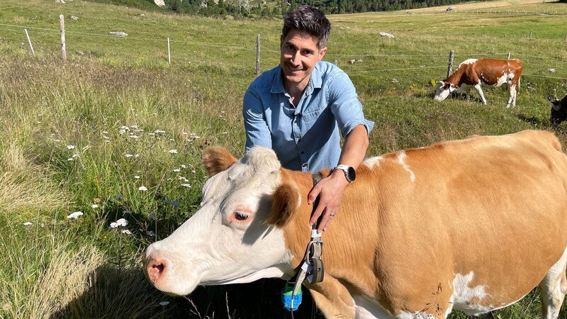 • Einstein Sterbende Alpweiden: Die Suche nach der perfekten Kuh — Einstein Moderator Tobias Müller mit einer Kuh auf der Alp