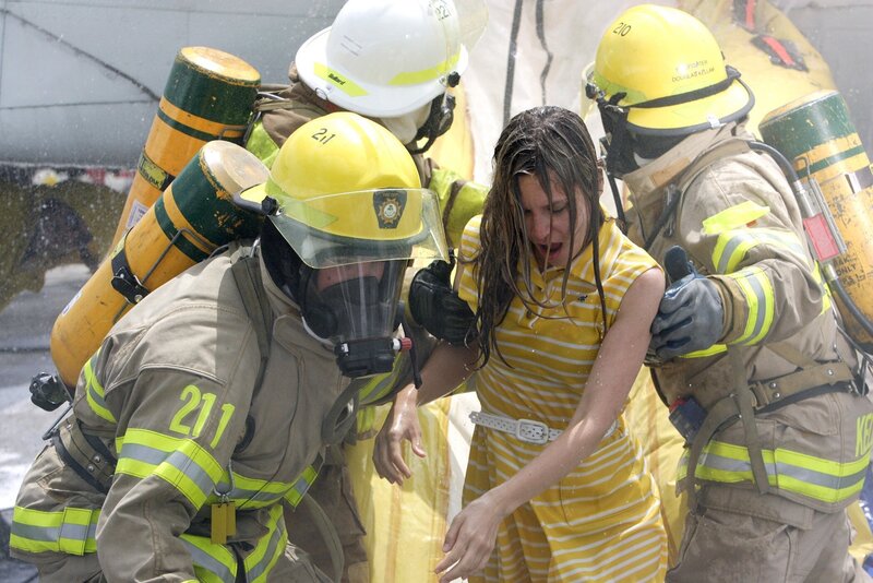 • Feuerwehrleute rutschen aus dem Flugzeug.