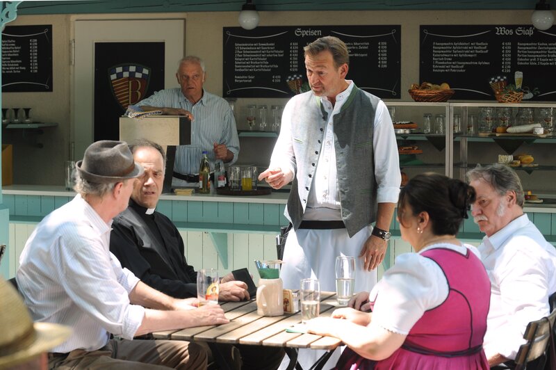 Gregor (Holger Matthias Wilhelm) verteidigt Vera gegenüber den tratschenden Lansingern.