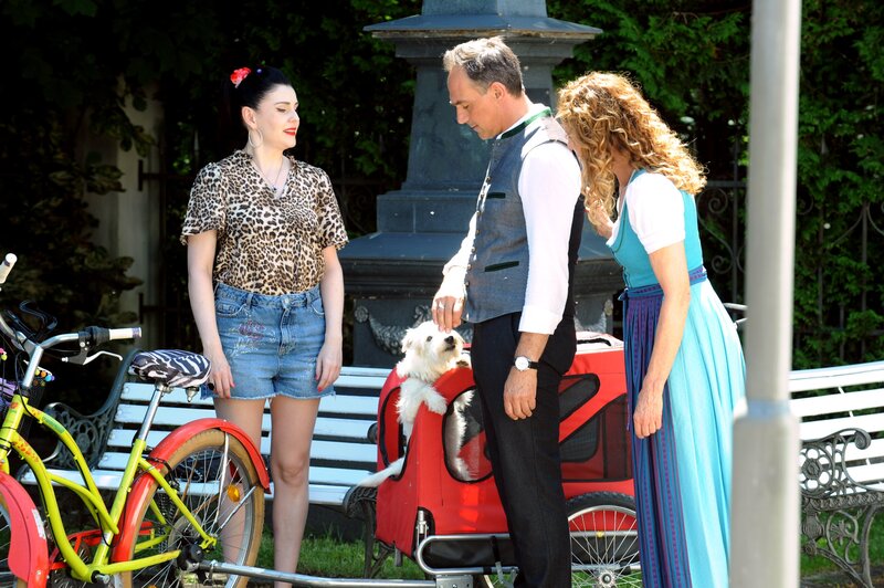 Mike lüftet sein Geheimnis, dass er Bruni mit Leckerlis bestochen hat, um sie in den Anhänger zu kriegen. Von links: Tina (Anita Eichhorn), Mike (Harry Blank), Annalena (Heidrun Gärtner).