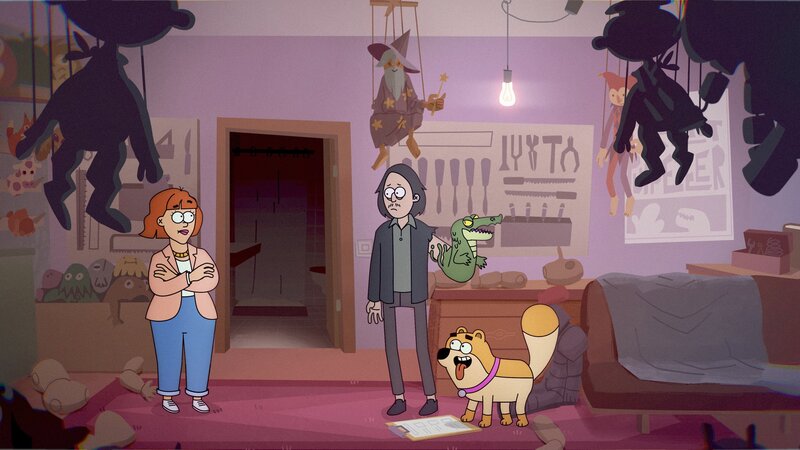 Handpuppenspieler Cosimo (M.) versucht verzweifelt in seiner Werkstatt die Bedingungen für eine artgerechte Haltung eines Krokodils zu erfüllen. Elli (l.) und Goldi (der Hund) prüfen dies genau.