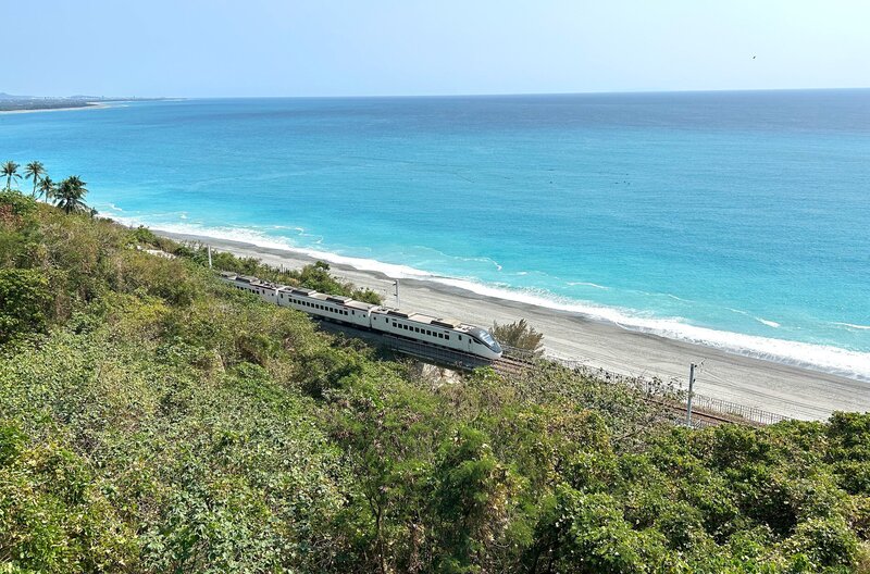 Intercity an der Ostküste Taiwans – der Pazifik macht hier seinem Namen alle Ehre – friedlich ohne viel Wellen säumt das Meer den menschenleeren Strand.