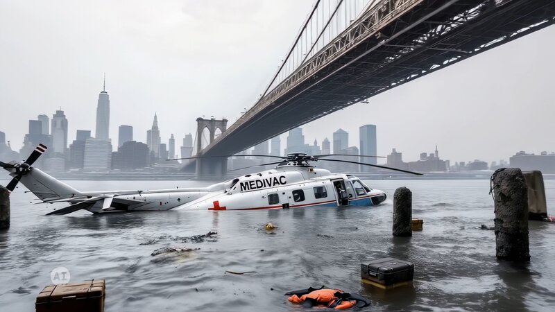 Ein medizinischer Evakuierungshubschrauber mit der Aufschrift „MEDIVAC“ liegt teilweise im Wasser versunken nahe einer Brücke mit der Skyline von New York City im Hintergrund; Trümmer treiben in der Umgebung.
