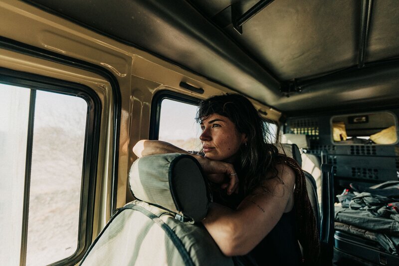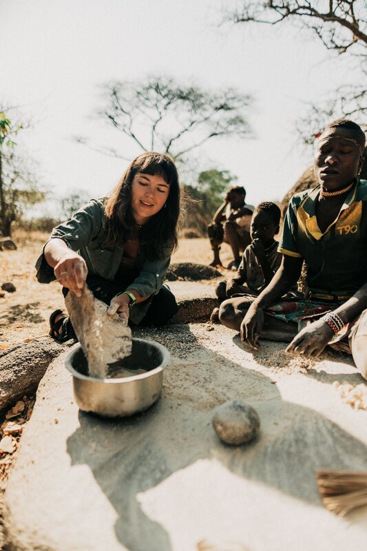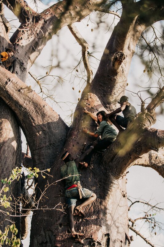 • Eva klettert mit Hadza-Jägern und -Sammlern auf einen Baum.