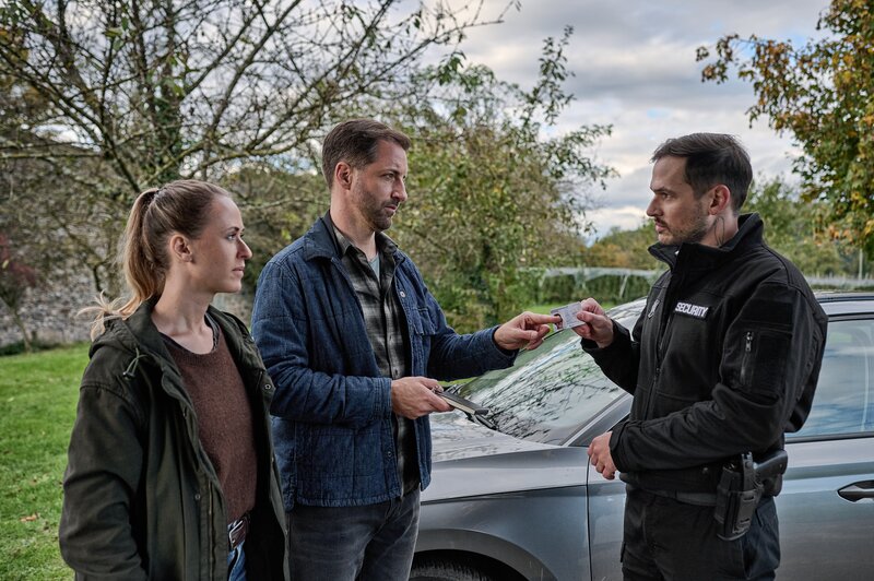 • Annika Wagner (Nurit Hirschfeld, l.) und Martin Keller (Dominik Maringer, M.) lassen sich von Michael Bacher (Sascha Weingarten, r.) den Ausweis zeigen.