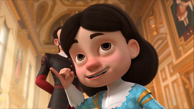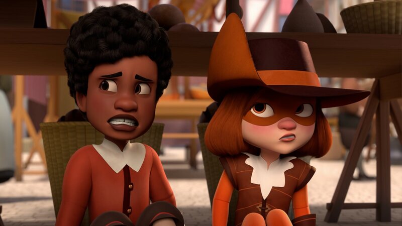 D'Artagnan (rechts) und ihr Freund Alex (links) verstecken sich hinter den Marktständen. Sie versuchen herauszufinden, wer die Königskrone gestohlen hat.