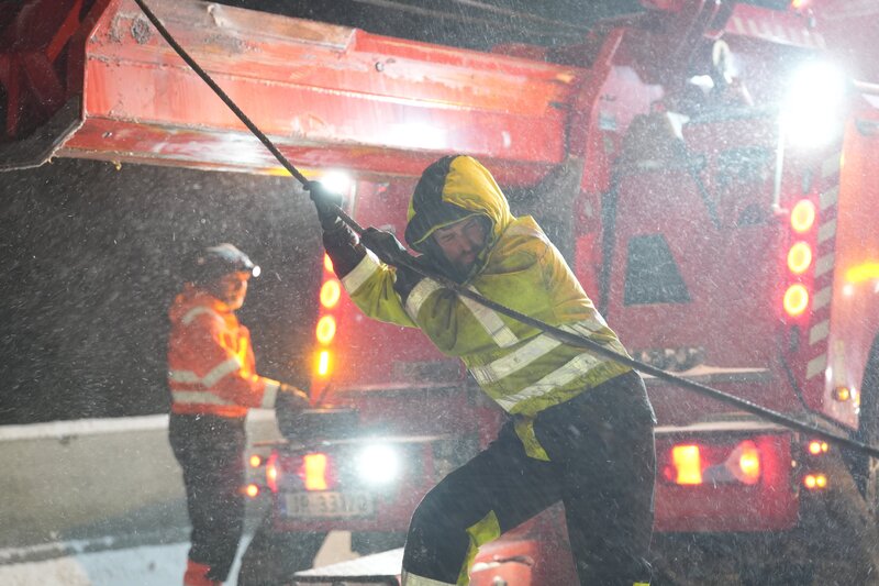 Bei dichtem Schneegestöber stoßen zwei Lkw zusammen. Um die Straße freizuräumen, braucht Thord sein gesamtes Team - und Hilfe von Bjoern. Dann rücken Malin und Domenic zu einer weiteren Rettung aus.
